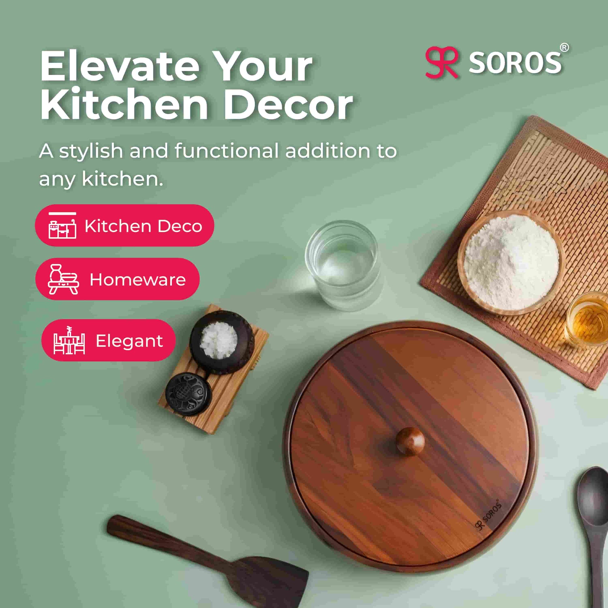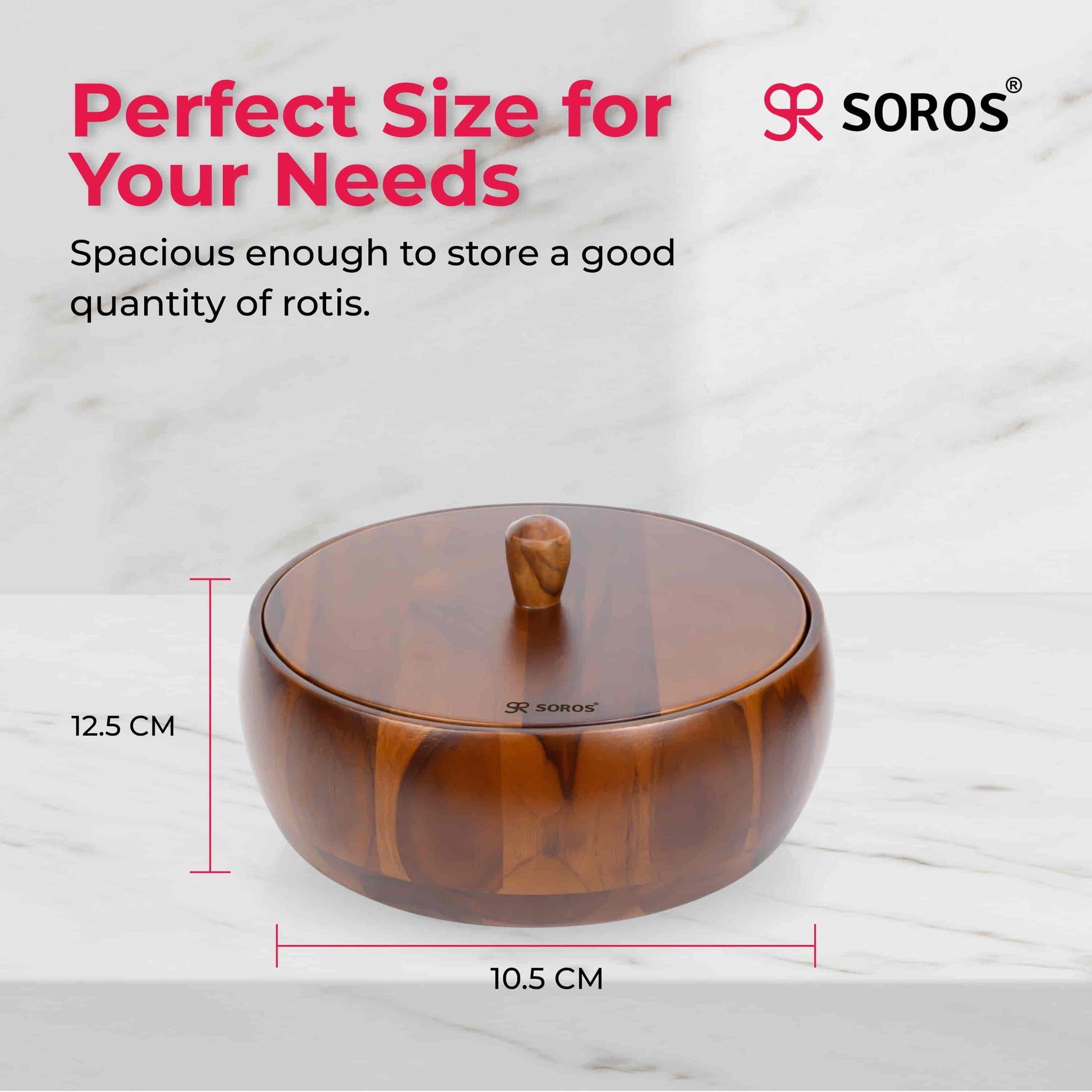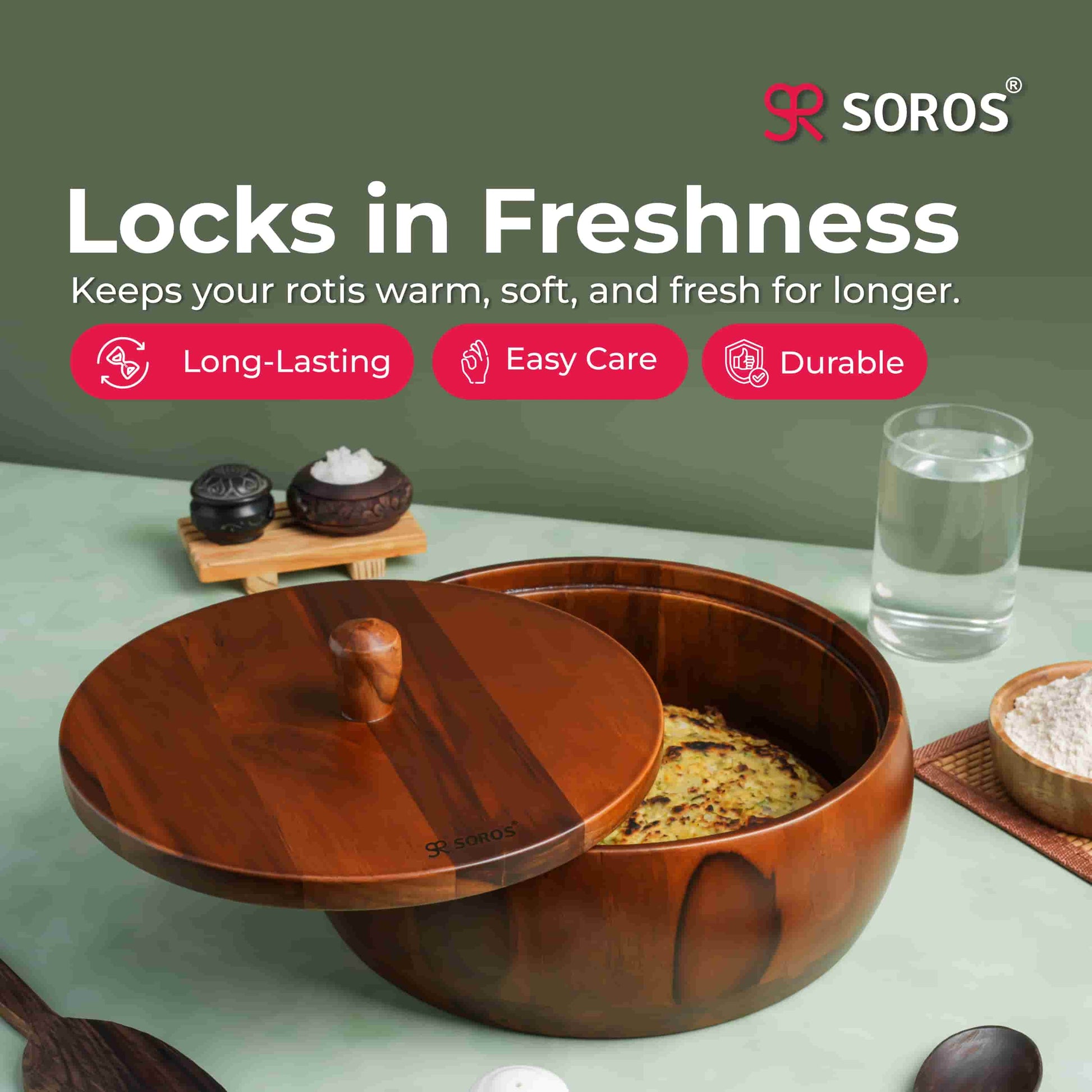 The SOROS Teak Wood Roti Box with Lid is a beautifully crafted storage container designed to keep your rotis fresh and organized. Made from high-quality teak wood, this casserole features a sturdy lid that seals in freshness and aroma. Its classic design complements any kitchen decor, while its durability ensures long-lasting use. Perfect for storing rotis, bread, or other baked goods, this box is a practical addition to your kitchen. The natural beauty of teak wood adds a touch of elegance, making it a lovely serving piece for your dining table.