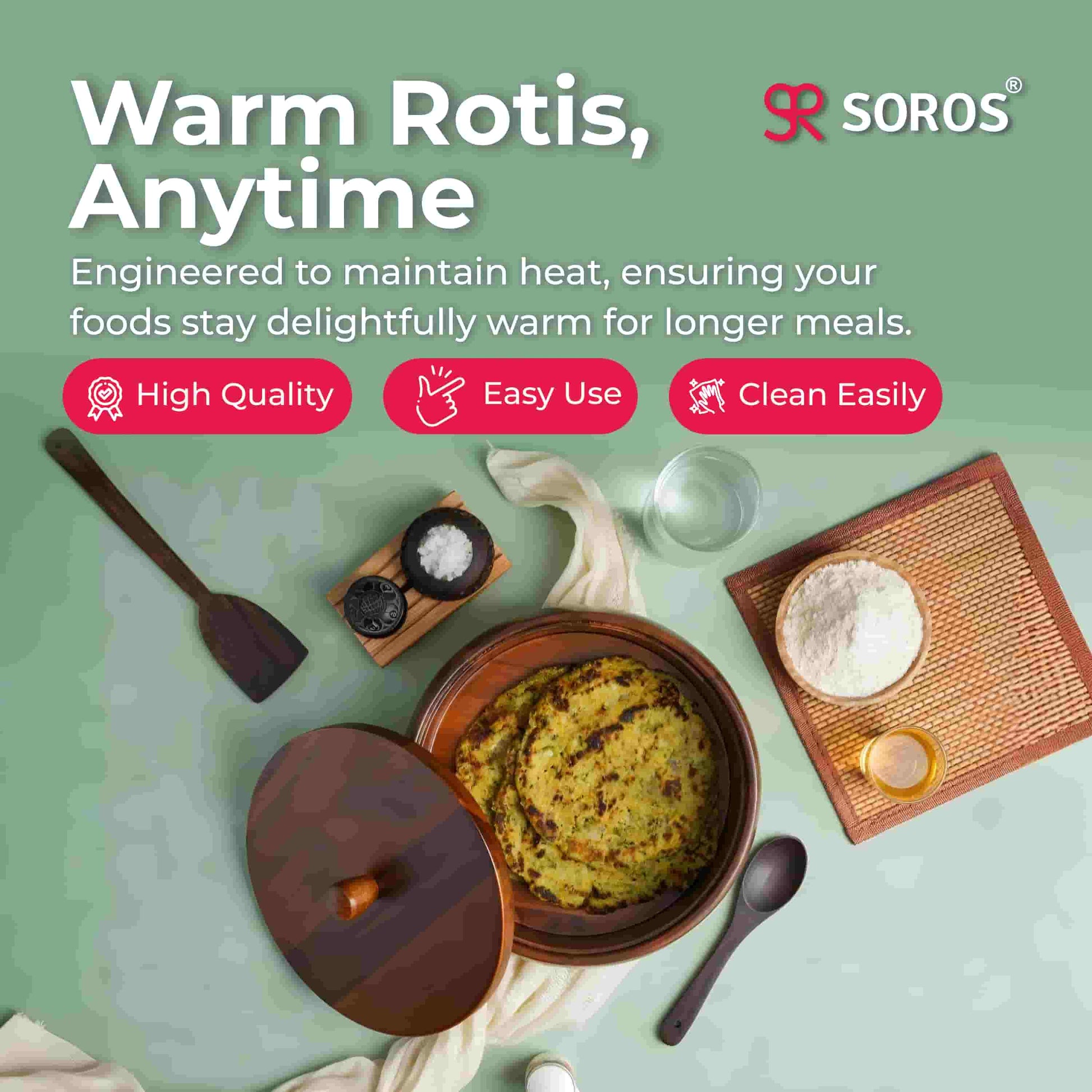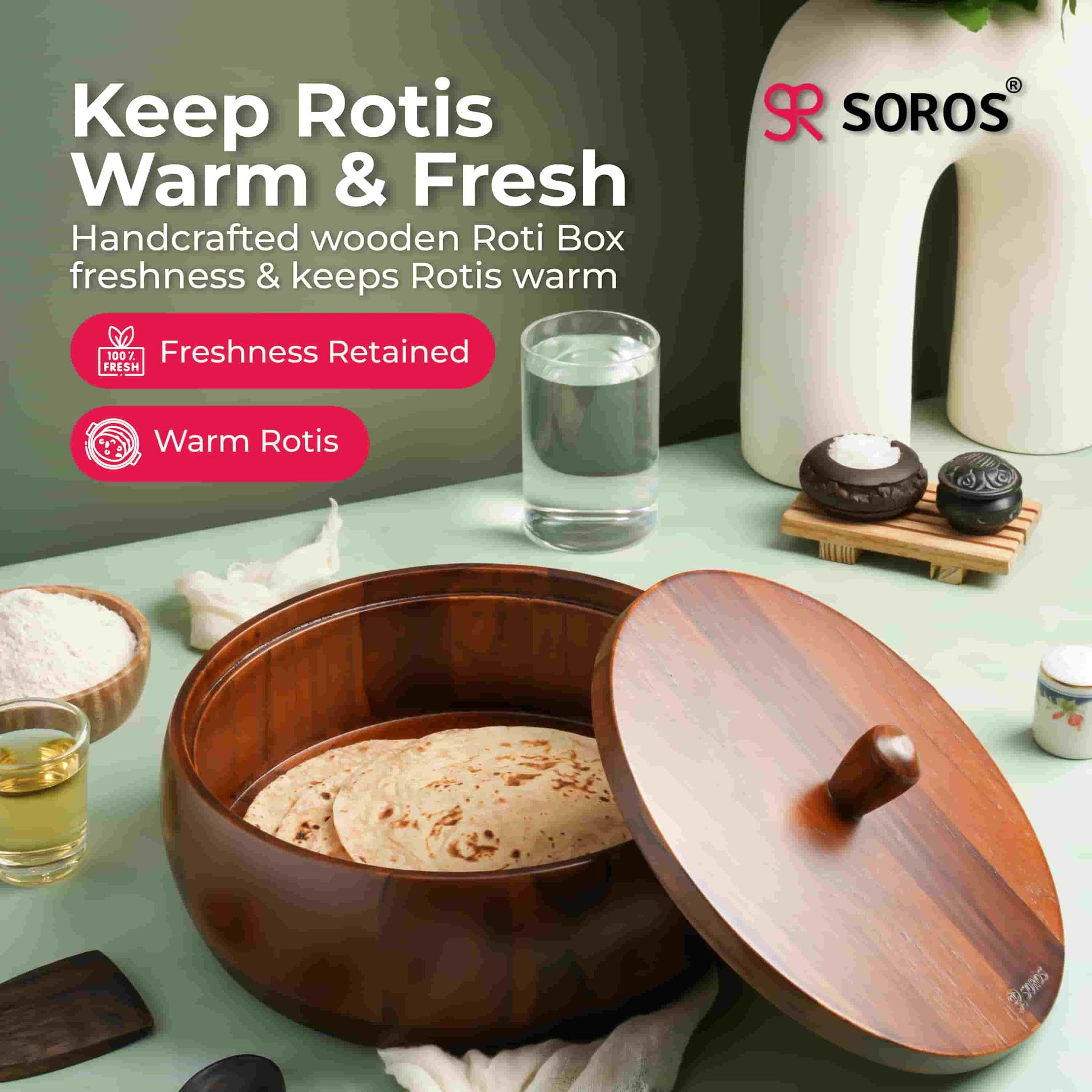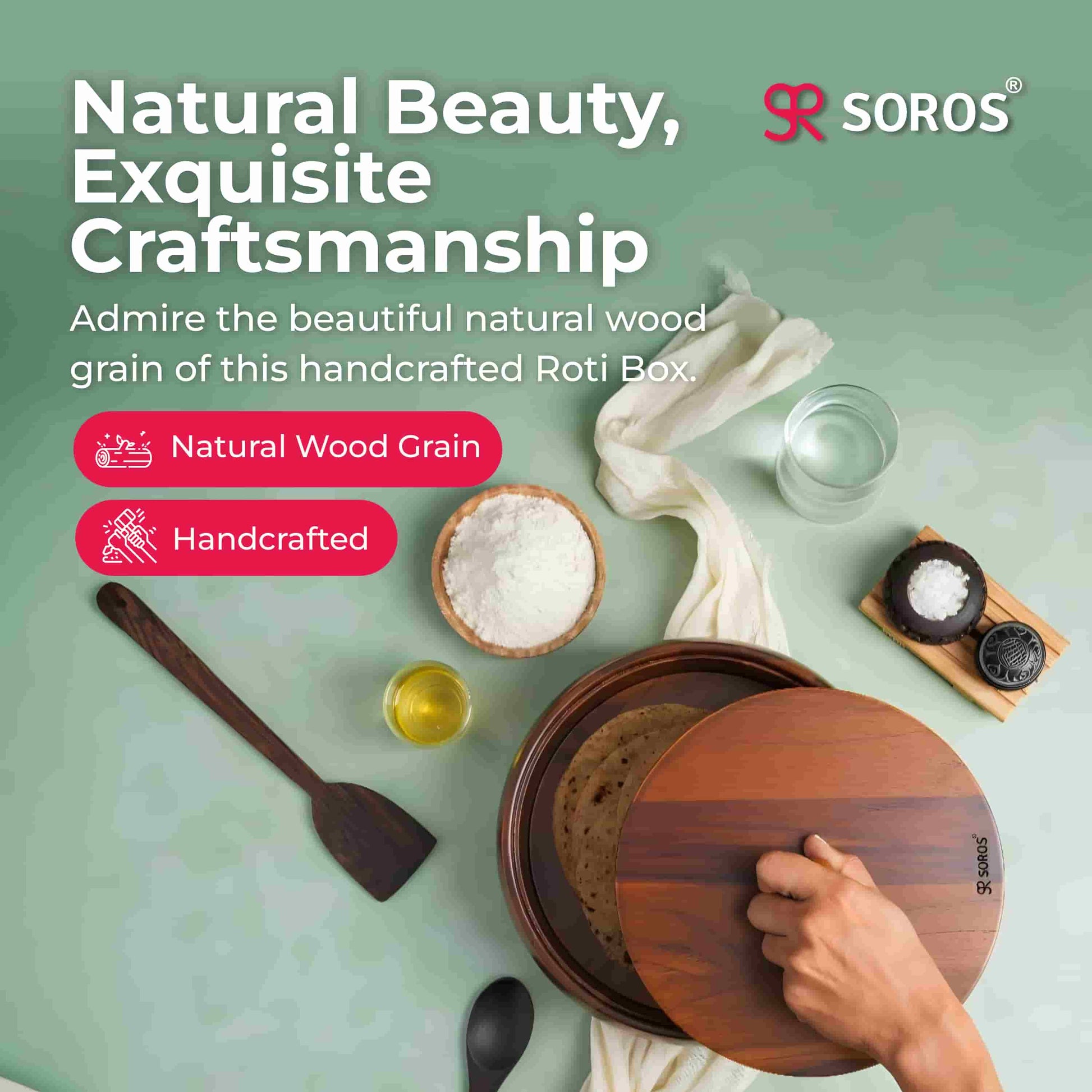 The SOROS Teak Wood Roti Box with Lid is a beautifully crafted storage container designed to keep your rotis fresh and organized. Made from high-quality teak wood, this casserole features a sturdy lid that seals in freshness and aroma. Its classic design complements any kitchen decor, while its durability ensures long-lasting use. Perfect for storing rotis, bread, or other baked goods, this box is a practical addition to your kitchen. The natural beauty of teak wood adds a touch of elegance, making it a lovely serving piece for your dining table.