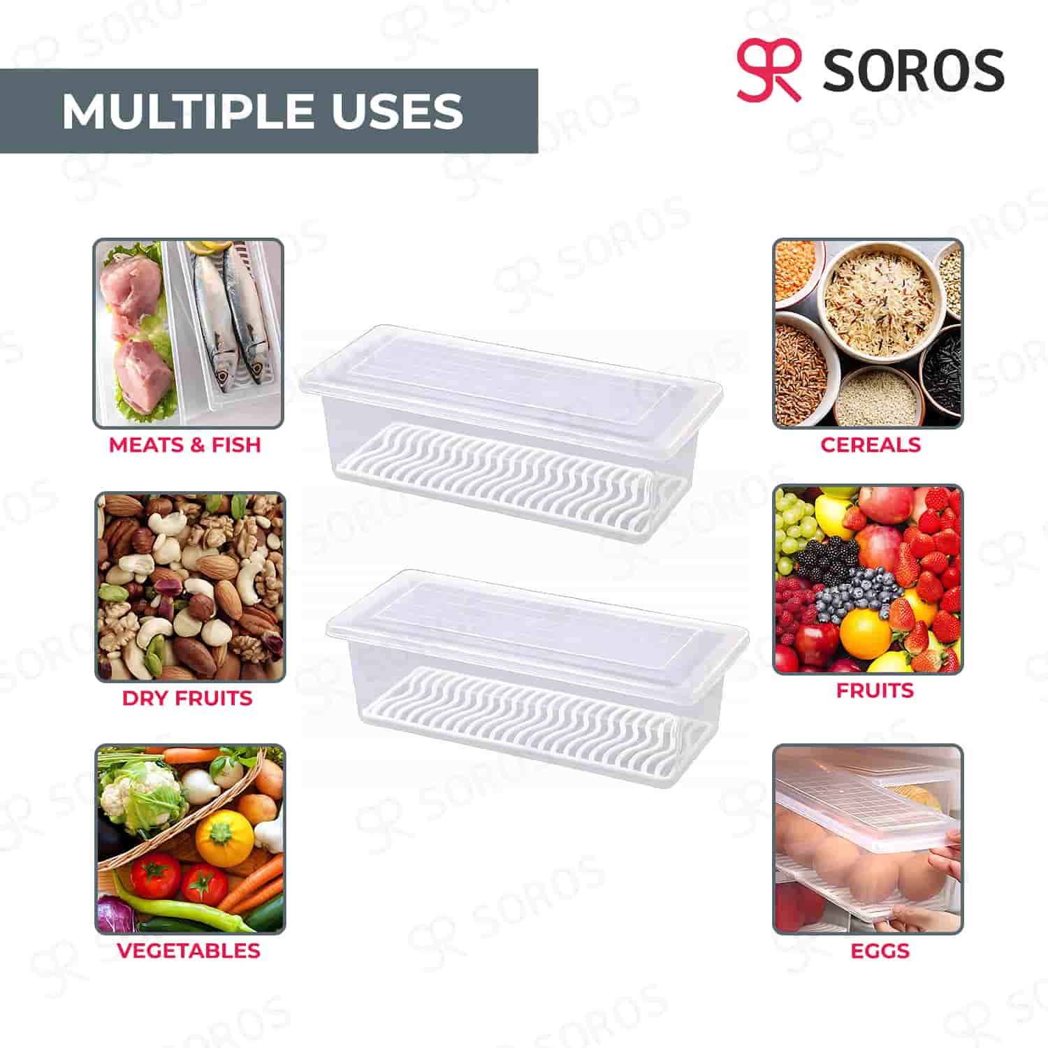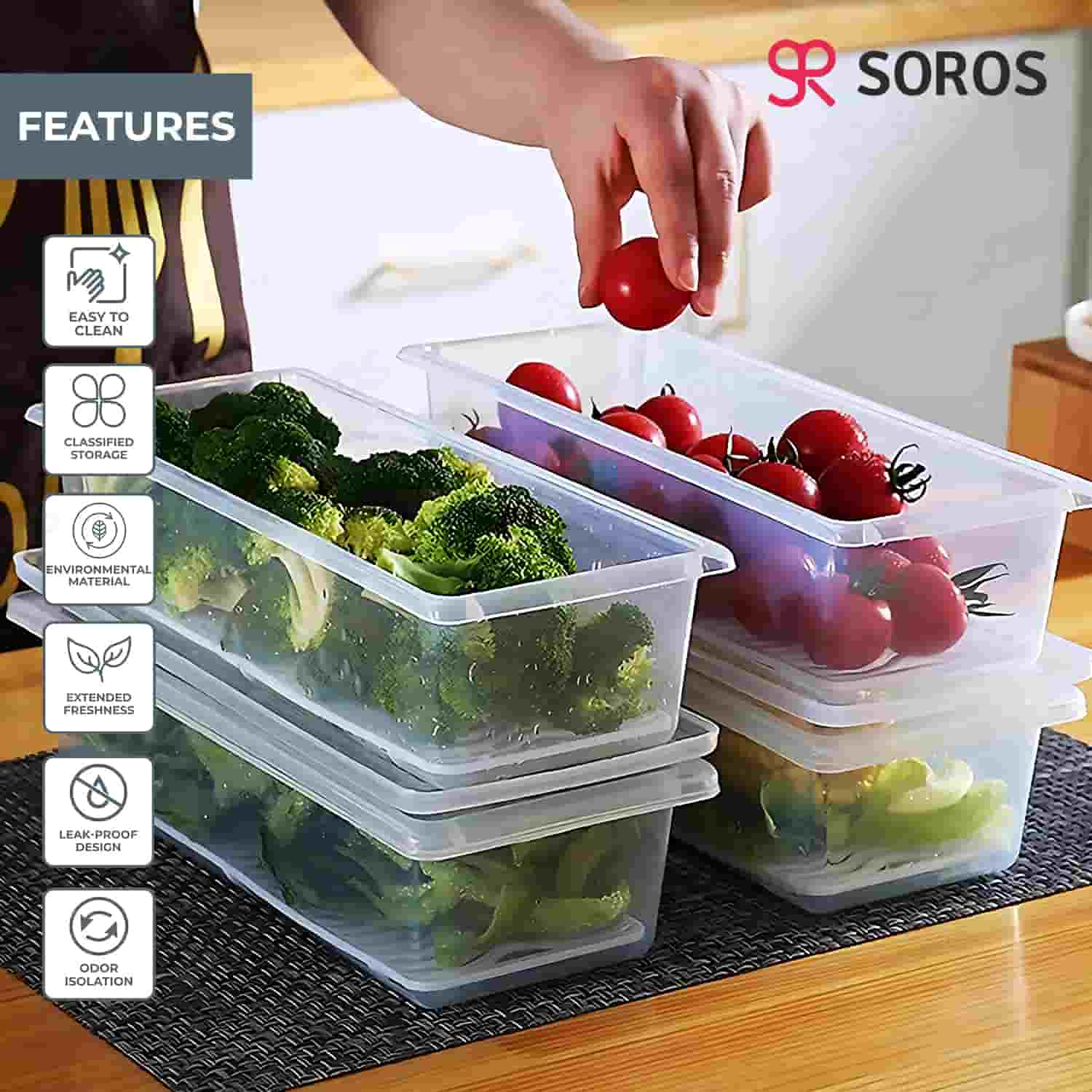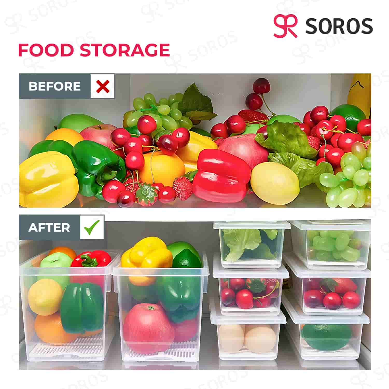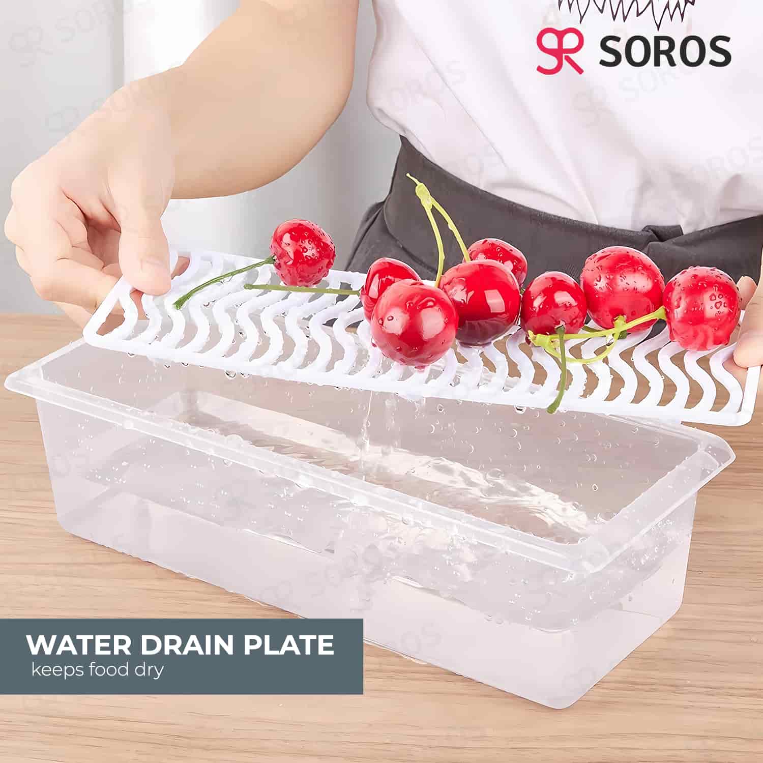 Soros multipurpose storage containers are perfect for storing various food items, keeping your fridge organized and odor-free. With a stackable design, they're ideal for maximizing fridge space and kitchen storage. Easy to clean and maintain, these containers drain moisture, prevent bacterial growth, and keep food fresh. Made from durable, food-grade plastic, they're long-lasting and versatile. The transparent design makes it easy to find what you need, while the elegant look enhances your kitchen's aesthetic. Soros containers fit perfectly in most refrigerators, freezers, and cupboards, ensuring efficient use of space.