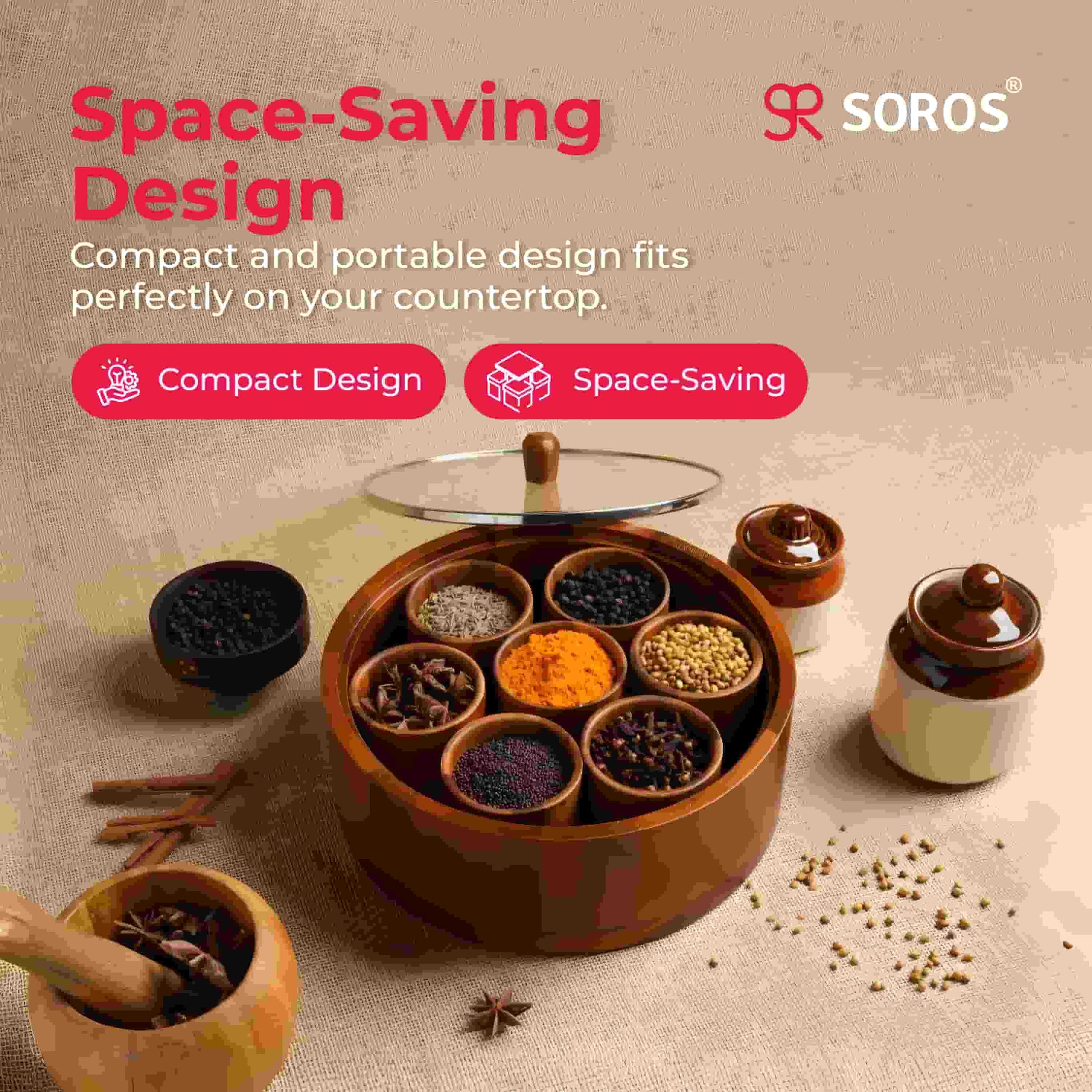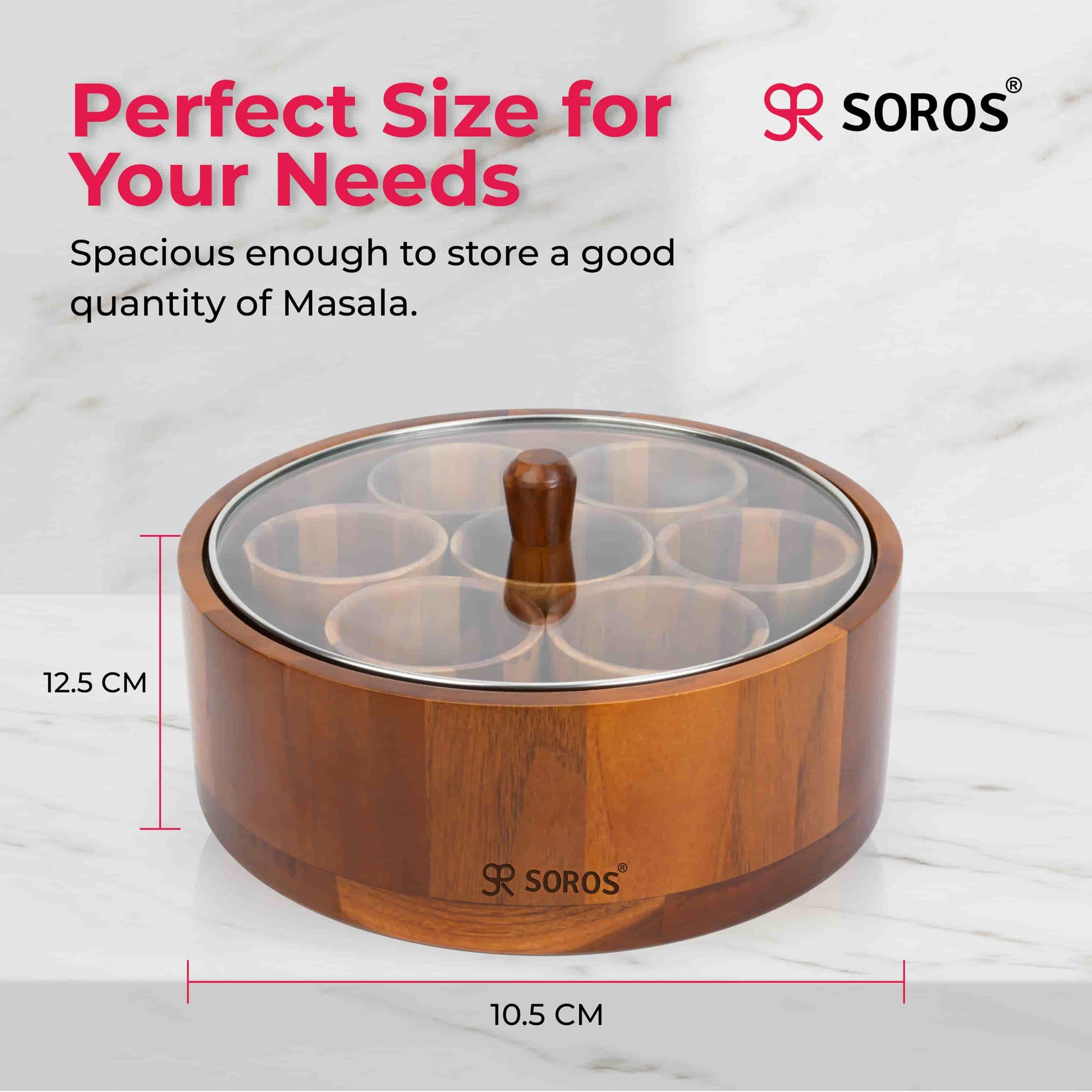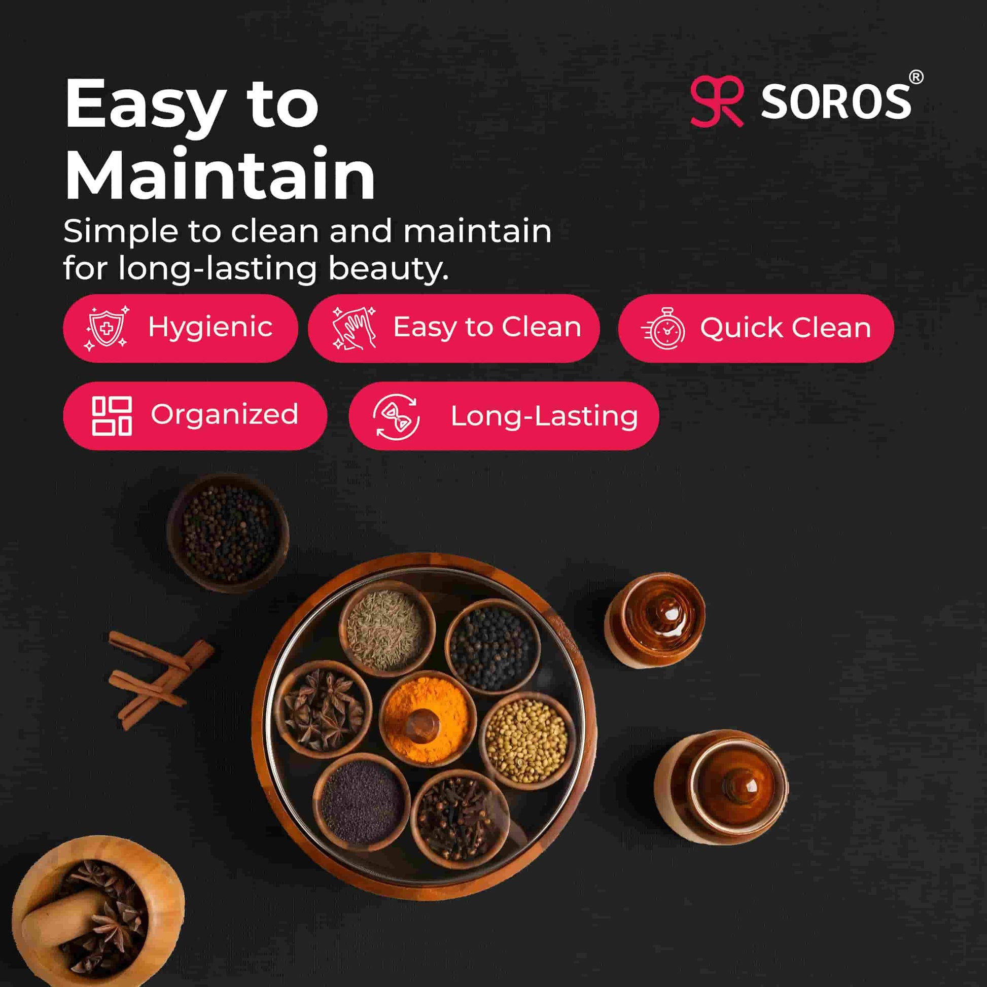 The SOROS Teak Wood Masala Box is a beautifully crafted spice storage container designed to add a touch of elegance to your kitchen. Made from high-quality teak wood, this masala box features multiple compartments to store your favorite spices and herbs. Its classic design and natural beauty complement any kitchen decor, while its durability ensures long-lasting use. Perfect for storing masalas, spices, or herbs, this box keeps your kitchen organized and your spices within easy reach. The teak wood finish adds a warm, rustic charm to your kitchen.